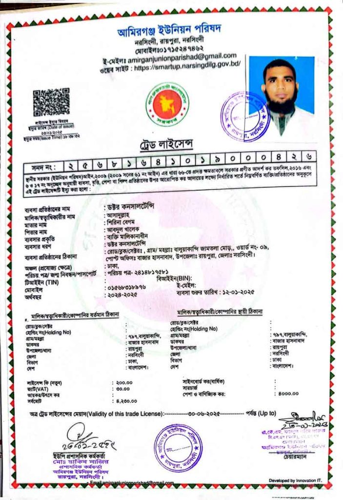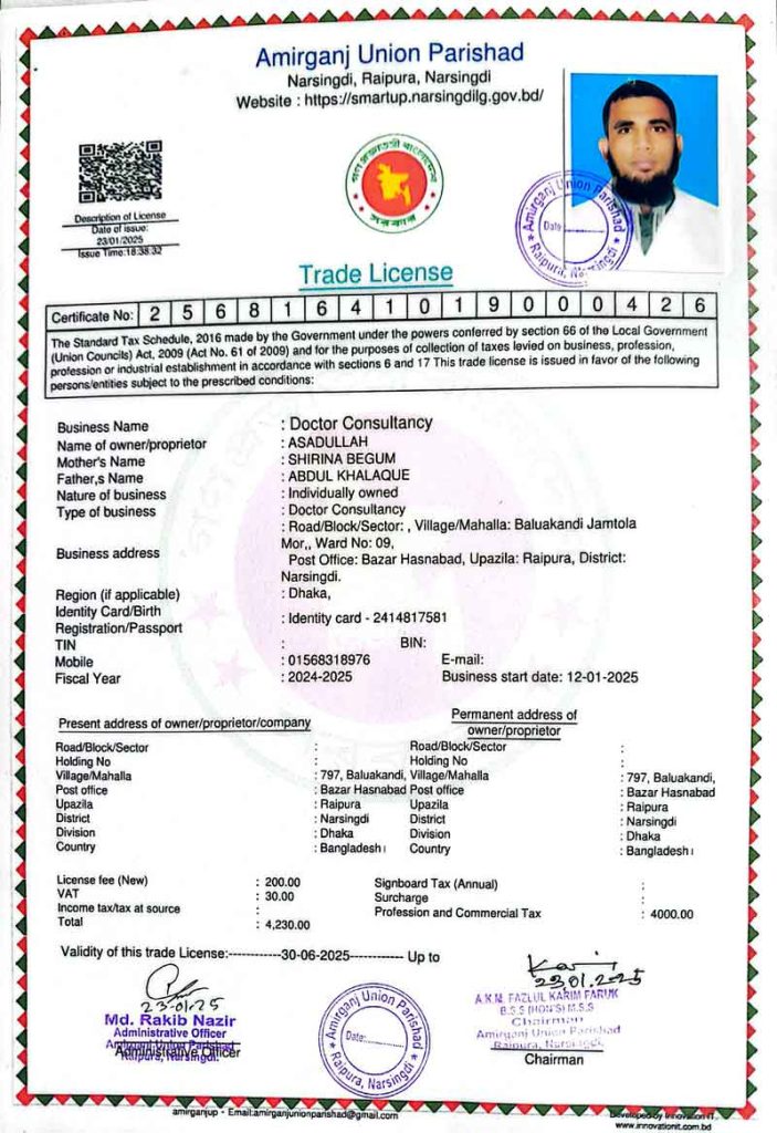 "Doctor Consultancy" Trade License Approved By People's Republic of Bangladesh